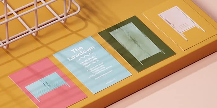 That relationship with MOO, and clever use of Printfinity, continued with Mustard. Business Cards were used as info cards, showcasing the full range of colours and styles available. These are now sent out to every stockist so retailers can help their smitten customers to go home, measure up their space and feel 100% confident in their choice of locker. These printed pieces embody the Mustard aesthetic, with a matte finish and one (perfectly matched) colour.