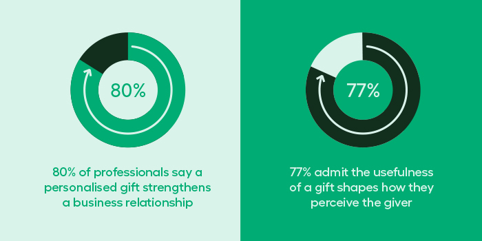 Personalization is really what makes gifts land. 80% of professionals say a personalised gift strengthens a business relationship, and 77% admit the usefulness of a gift shapes how they perceive the giver.