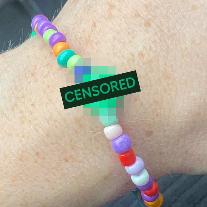 „Hier ist mein Plastikarmband, das ich 2024 bei einer Podcast Show in London bekommen habe. Zuerst dachte ich mir wie WITZIG. Aber das schlug schnell in „okay, wo ist der nächste Mülleimer?“ um.“
