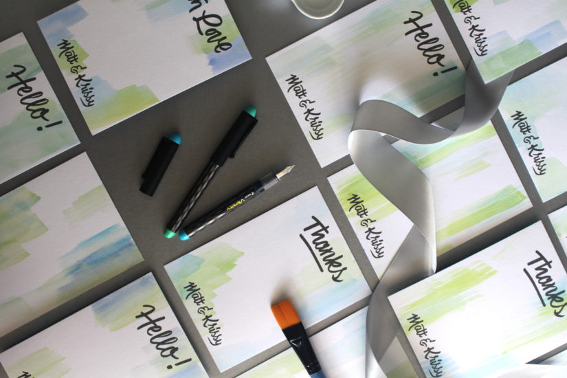 Als meine Freunde sich verlobt haben, war ich überglücklich. Da die Braut ebenfalls Designerin ist, war mein zweiter Gedanke natürlich, dass ich ihnen ein wirklich cooles Verlobungsgeschenk machen muss. Nachdem ich ein paar Konzepte verworfen hatte, die ein bisschen zu aufwendig oder schwierig umzusetzen waren, beschloss ich, ein Set personalisierter Briefkarten mit Monogramm und speziell entworfener Schrift zu erstellen. Oh So Beautiful Paper ist einer meiner Lieblingsblogs, um nach einzigartigen und eleganten Ideen für Schreibwaren zu stöbern und er war besonders hilfreich, als ich Inspiration für dieses Projekt suchte. Ich nahm mir auch ein Beispiel an vielen Schriftkünstlern, wie Ken Barber von House Industries, als ich meine Schrift zu Papier brachte – wozu ich ausschließlich einen Fasermaler von Tombow mit zwei Spitzen verwendete.