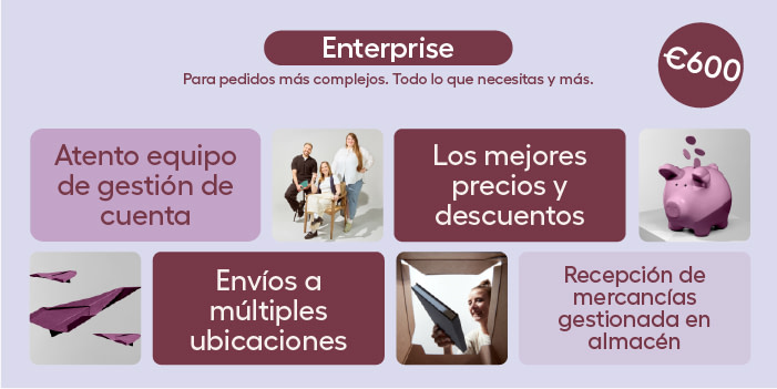 Para grandes empresas con mayor volumen de trabajo, Enterprise ofrece un servicio más completo de asistencia para gestionar pedidos más grandes y complejos.