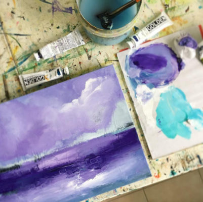 La inspiración de Drew viene del presente: “mis emociones guían mi pintura (el color, la composición y el estilo) en muchas direcciones diferentes. Mi proceso creativo consiste en dejar que mi intuición esté al cargo y no ser demasiado exigente conmigo misma.”
