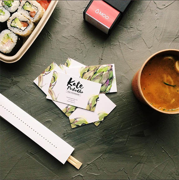 Por supuesto, las tarjetas de visita de Kate tenían que estar relacionadas con la comida, su mayor inspiración. La decisión más dura fue elegir entre incluir espárragos o alcachofas en sus tarjetas, dos de sus ingredientes favoritos. Al final se decantó por las alcachofas (fantástica elección) y su amigo Tomas, diseñador, le ayudó con las ilustraciones.
