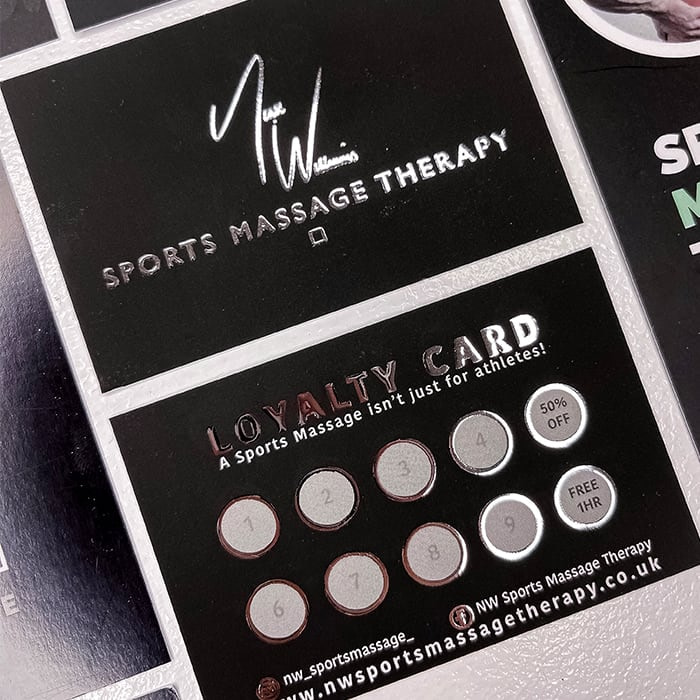Para su cliente Niall Williams Sports Massage Therapy, Laura ha creado un conjunto de material de marketing, incluso unas impresionantes tarjetas de fidelidad. Ha elegido las tarjetas de visita con estampado plata por su llamativo acabado metálico, que recuerda casualmente al reluciente equipo del gimnasio. “Me encanta el acabado de estas tarjetas. Añade ese elemento sorpresa, incluso a los diseños más simples. […] Queríamos utilizar el estampado plata en contraste con el negro mate porque sería súper impactante. Para mi cliente he creado un logotipo con esta firma característica, y él lo ha impreso en la pared de su gimnasio, así que el material de marketing a juego con el elegante acabado en plata era imprescindible.”