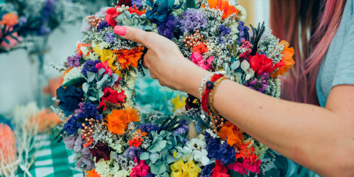 Y lo llamo “el accidente más bonito”. Cuando perdí mi empleo en marketing a solo tres meses de mi boda, me lancé de cabeza a planearla. Me frustré cuando las únicas coronas y ramos de flores disponibles se marchitaban rápidamente así me hice mis propios arreglos para mí y para mis damas de honor con flores deshidratadas. Recibí comentarios magníficos y la gente empezó a animarme a vender las coronas. La oportunidad se me presentó y decidí intentarlo.