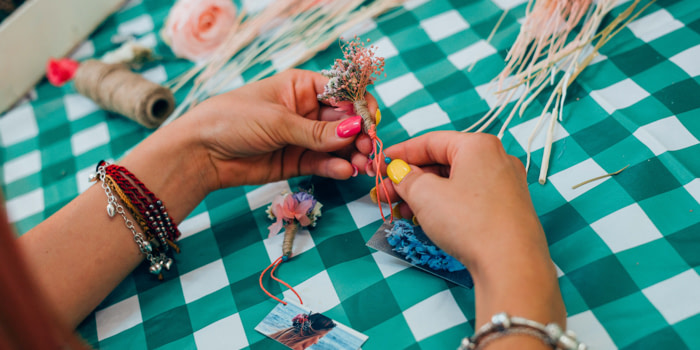 Empecé vendiendo en un festival artesanal local. Ese día vendí más de 40 coronas en solo cuatro horas y repartí tarjetas de visita mini con pétalos pegados. Por supuesto también estamos disponibles online a través de nuestra página web y en las redes sociales, pero la mayoría de la promoción la hago en eventos, ferias y festivales. Me aseguro de llevar conmigo suficientes tarjetas de visita y flyers, ¡nunca sabes a quién vas a conocer! También organizamos jornadas de puertas abiertas en nuestro estudio en verano y las novias pueden concertar una cita para venir al estudio, charlar un rato y ver mi trabajo.