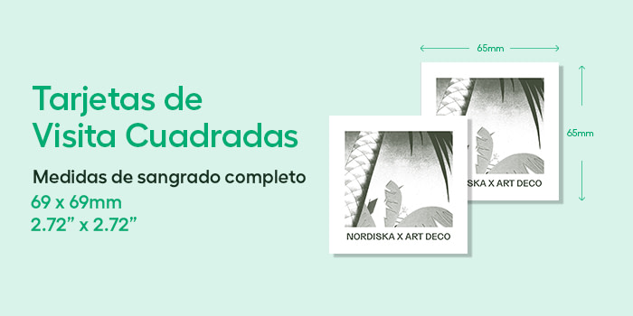Nuestras tarjetas de visita cuadradas, además de atractivas, miden 65 mm o 2,55″ por todos sus lados, por lo que tu sangrado completo debería coincidir con las siguientes medidas:
