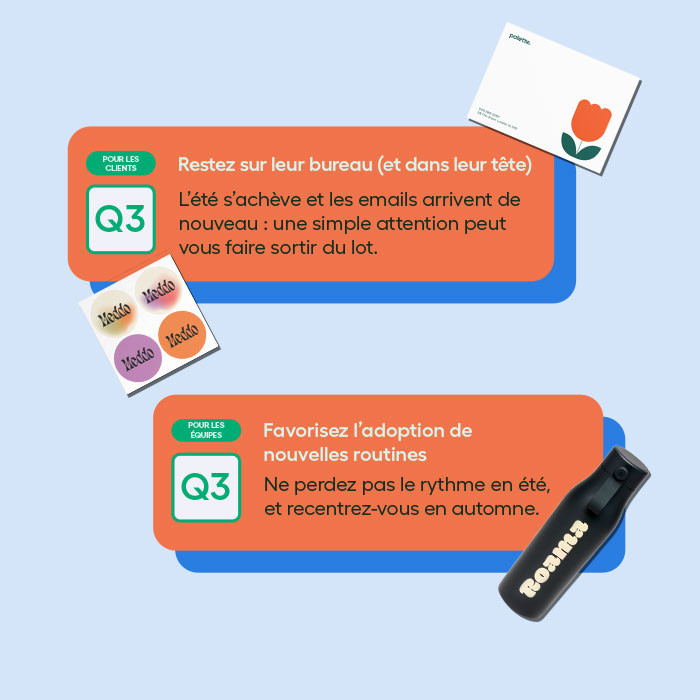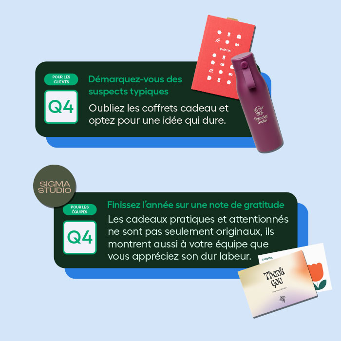 Un nouveau carnet en janvier, lorsque la motivation est à son comble. Une gourde MOO haut de gamme en plein été, quand l’hydratation est une priorité. Une carte de correspondance Luxe ou une carte postale personnalisée pour marquer un succès. Ces attentions créent un lien authentique, car en plus d’être joliment emballées, elles tombent surtout à point nommé.