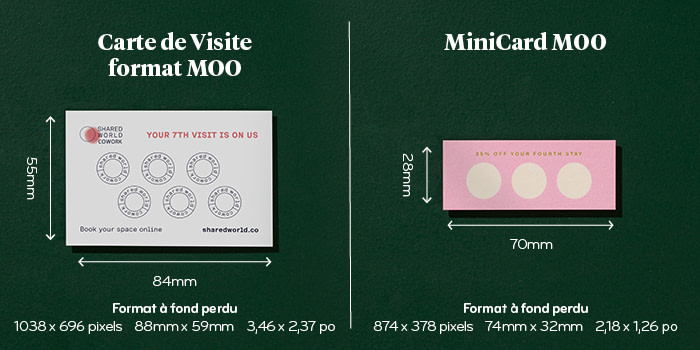 Les dimensions les plus populaires sont la carte standard de 2″ x 3,5″ et la carte MOO de 2,16″ x 3,3″. Mais rien ne vous empêche d’essayer d’autres formats. Vous pouvez également opter pour le format Carré de 2,56″ x 2,56″. Si vos clients n’effectuent que quelques visites, vous pouvez opter pour une carte encore plus petite. La MiniCard, avec des dimensions de 2,75″ x 1,10″, pourrait inciter les clients à agir rapidement, car la récompense leur semblera facile à obtenir.