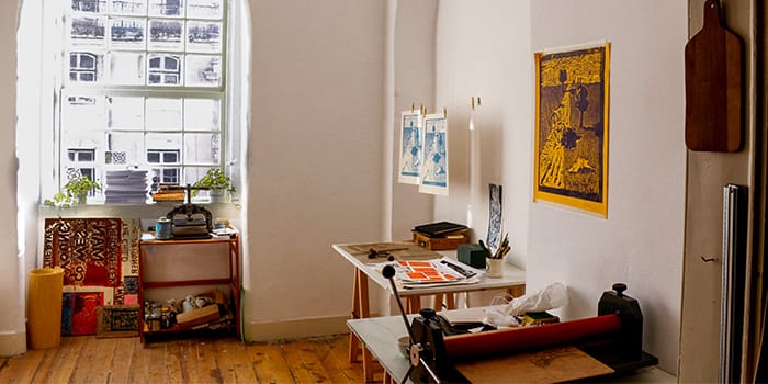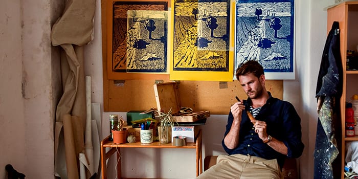 La xylographie, ou impression via la gravure sur bois, est la technique d’expression préférée de Tom, basé à Lisbonne où il est en résidence à Zaratan.