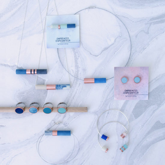 Floriane Leblong, is based in Lille, France. She aims to create ‘new energy’ through her handmade jewelry line, ‘Empreintes d’apesanteur’ by combining a variety of materials to create a totally new product. Floriane studied Textile Design for 3 years at the Ecole Duperré in Paris. She then went on to do a Higher Diploma of Applied Arts at Esaat in Roubaix. Following her studies, Floriane got a job as a textile designer for an upholstery and wallpaper company. It was alongside this that she created her first jewelry line.