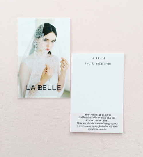 La Belle sends her Business Cards out to clients ordering fabric swatches. When creating her cards, Hannah knew she needed a clean and elegant design: “we chose hues that would work seamlessly with our other branding and match the materials we use in the studio. The final card features a photograph of one of our models wearing a delicate, translucent bridal veil. We chose this specific image to complement and heighten the impact of the fabric samples”.
