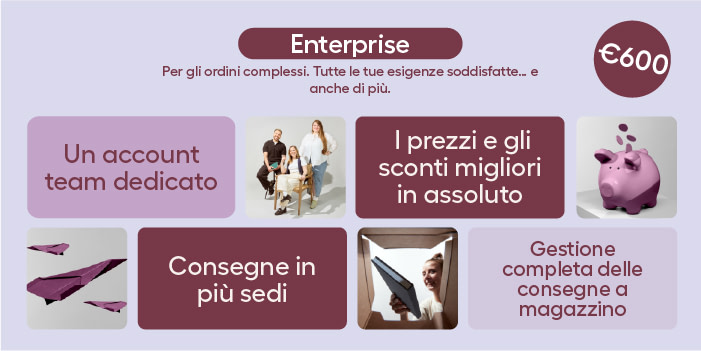 Alle aziende più grandi e con i volumi più elevati, Enterprise offre il massimo livello di supporto personalizzato, pensato per gestire gli ordini più grandi e complessi.