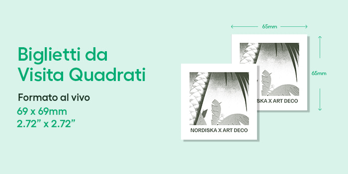 I nostri splendidi Biglietti da Visita Quadrati misurano 65 mm (o 2.55”) su tutti i lati, quindi le misure al vivo da considerare sono le seguenti:
