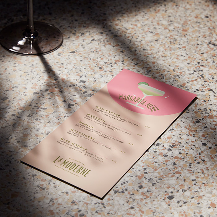 Come sempre, evita i font troppo sottili o in corsivo, più difficili da leggere, e se decidi di avere menù separati per bevande, cibo e dessert, fai in modo che siano legati tra di loro. Un’esperienza di branding senza soluzione di continuità garantisce un messaggio positivo e dovrebbe comunicare l’essenza del tuo marchio.
