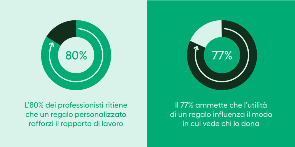 Sono i regali personalizzati a fare davvero la differenza. L’80% dei professionisti ritiene che un regalo pensato su misura rafforzi il rapporto di lavoro, e il 77% ammette che l’utilità del regalo influenza il modo in cui vede chi lo dona.