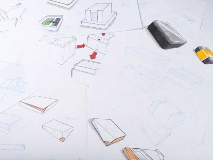 After a few rounds of sketching and evaluations, we chose some ideas we wanted to explore using physical mock-ups. This is the first time you really get a sense of the size and proportion of the design. We often start with thin paper, as it’s a fantastic material to work with to get instant results. Again iterations of each design are important, before you move on to more detailed prototypes that involve colours and textures.