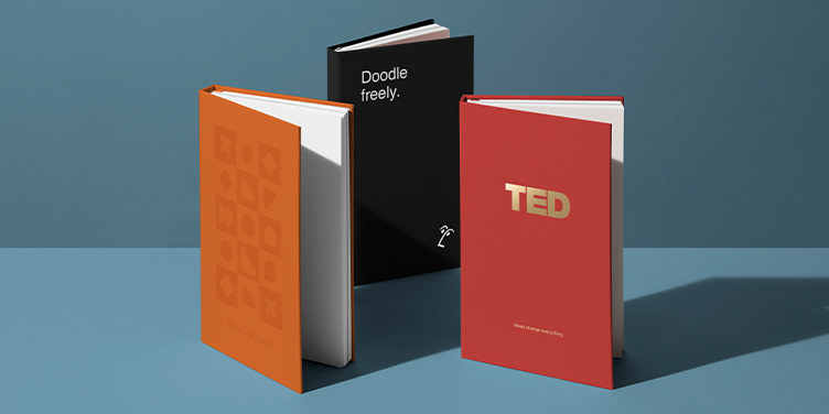 Foil stamping adds metallic accents to your cover colour. A deep green cloth cover with Gold Foil creates instant luxury. Black with silver foil feels luxe and modern. TED’s Gold Foil Cloth Hardcover Notebook is a classic, elevated design.
