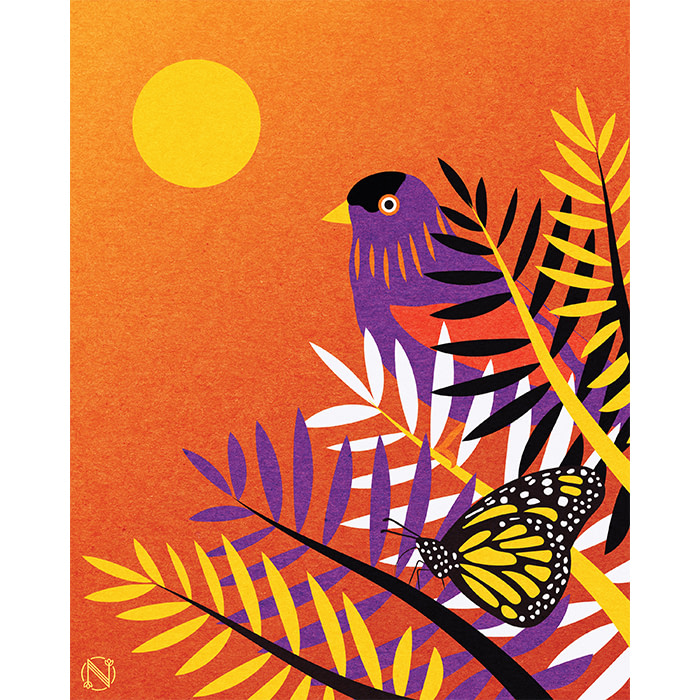 With a background in ecology, graphic designer, artist and educator Natalie Luz’s work is firmly rooted in nature. Her colorful and flowing designs are filled with flora and fauna, often with a surreal edge.