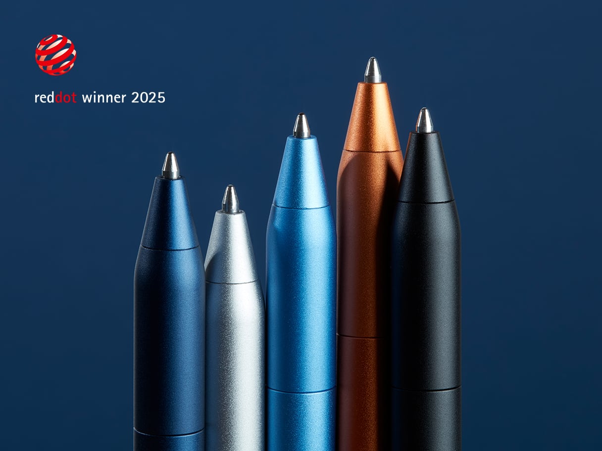Un stylo à bille primé pour son design. Poids agréable en main, rechargeable, recyclable. Rotatif.