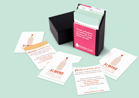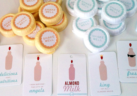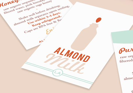 Almond Milk LA fabrique, met en bouteille et livre du lait d'amande brut, biologique, sans OGM, sans lactose, sans gluten et sans soja. Ils utilisent des produits MOO pour donner à chaque bouteille une touche personnelle, depuis les autocollants "Shake Well" (Secouez fort) apposés sur les bouchons, jusqu'aux étiquettes de bouteille, fabriquées à la main à partir de Cartes de Visite MOO.