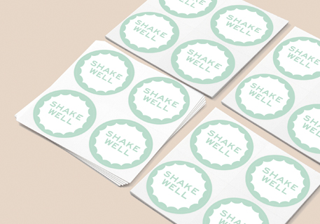 « Nos étiquettes de bouteille sont des Cartes de Visite à Coins Arrondis que nous trouons une par une à la main, et les autocollants ronds MOO sont parfaits pour les étiquettes "Shake Well" que nous collons sur chaque bouchon. »